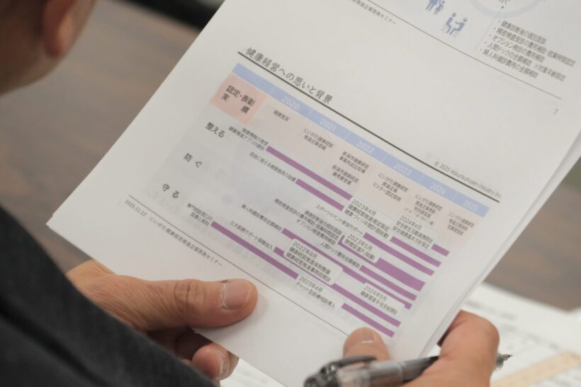 にいがた県健康経営推進企業表彰で表彰された企業の取り組みを、県民と県内企業に周知していきたいと考え、今日は皆さんが情報共有する場を作らせていただきました。参加された企業の皆さまには取り組みをお話しいただくとともに、皆さま自身も新たな発見や気づきも得られる場になればと思います。