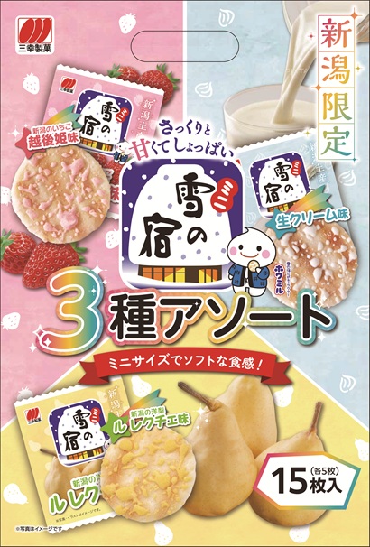 三幸製菓グループの株式会社みゆき堂本舗(新潟市北区)は、三幸製菓株式会社のロングセラーブランド「雪の宿」から、新潟県の特産品フレーバーを詰め合わせたお土産向け商品「ミニ雪の宿 3種アソート」を、2月中旬より新潟県内限定で発売する。