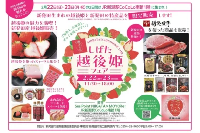 新発田市産業連携推進委員会は2月22日と23日の2日間、新潟駅CoCoLo南館1階「Sea Point NIIGATA × MOYORe:」にて「しばた越後姫フェア」を開催する。時間は両日とも11時30分から18時までで … 続きを読む 【越後姫を使ったスイーツが大集合!】新潟駅CoCoLoで「しばた越後姫フェア」開催