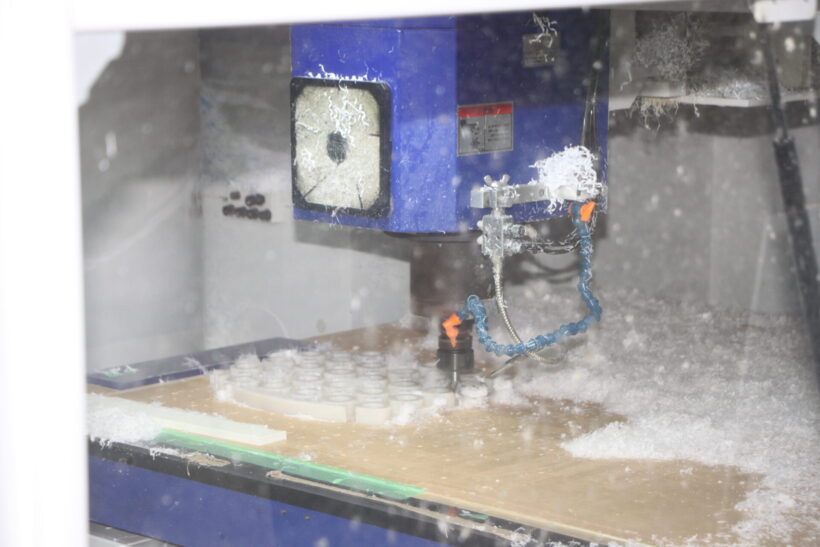 工場に入ると、まず目に入るのは積み上げられた材料、板状の樹脂。これがNCルーターや旋盤で切削加工され、まるでプラモデルの部品のように断裁されていく。