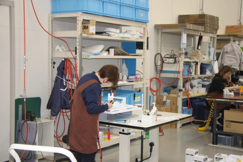 生産現場を見て気付くのは、同じ形状のものを大量に流れ作業で作っている光景が、ほとんど見られない点だ。オリジナル製品の試作や、部品1点からのオーダーメイド製作に力を入れているのもわかる。工程の下流の方には組み立てられた装置が並んでおり、一枚の樹脂の板が最終的に装置に組みあがるまで一気通貫で完結しているのがよくわかる。こうした多様な要求への対応力は大手がまねできない分野であり、安定した需要獲得への道筋になっている。