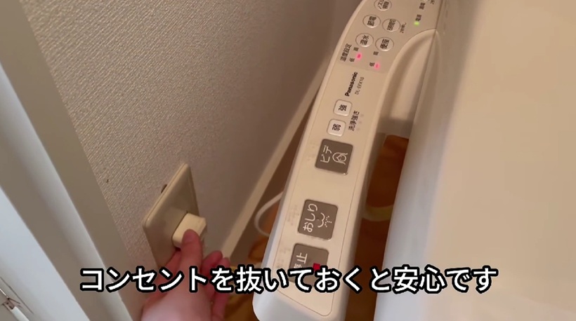 ですが、止水栓を止める前に、このような温水洗浄便座、ウォシュレットやシャワートイレなどが付いている場合は、コンセントを抜いておくと安心です。