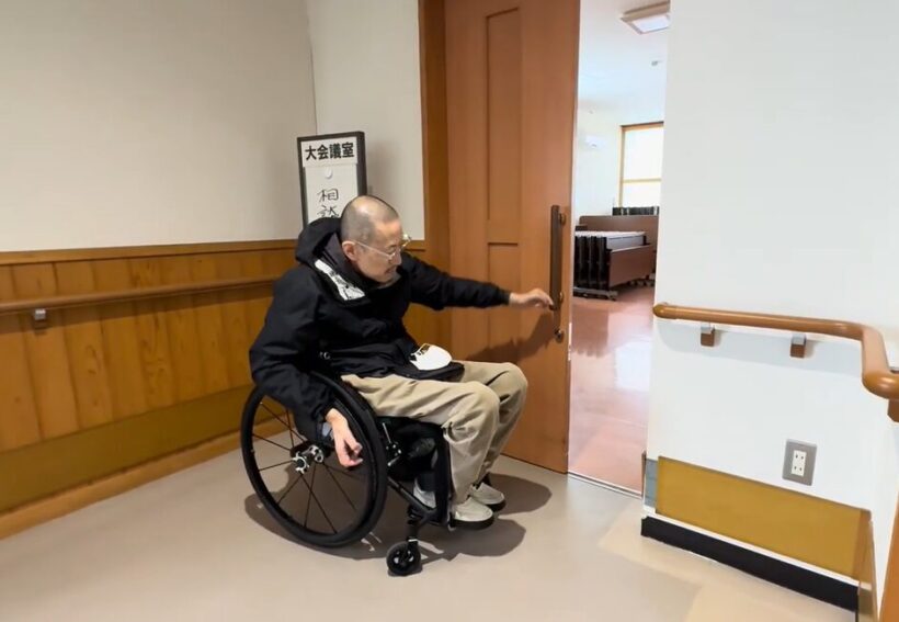扉を開ける髙橋さん。県庁でも福祉保健部など、障害者が利用する機会の多い階では引き戸を導入している