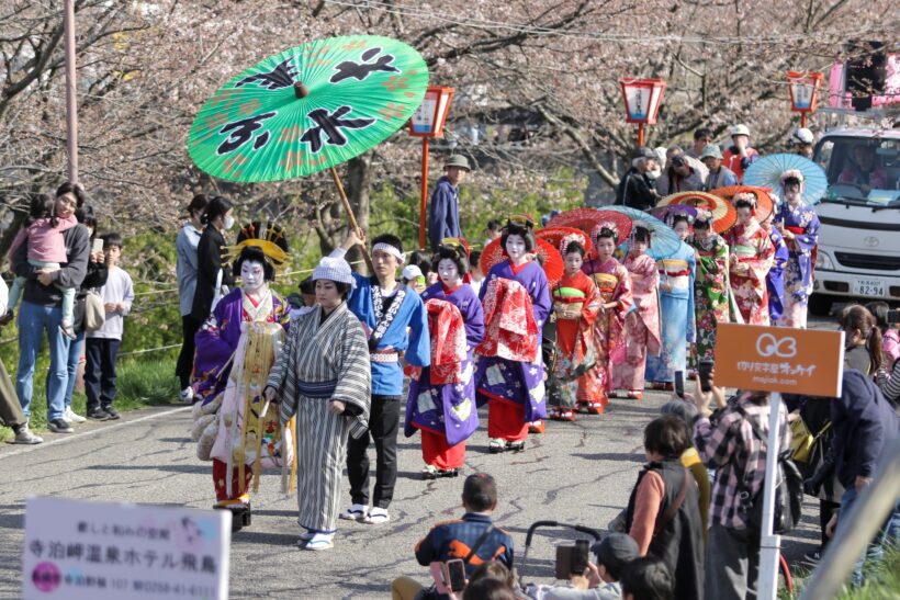 当日、おいらん道中が歩く時間帯は、地蔵堂本町通を12:00から、大河津分水桜並木を14:00からと予定されている。