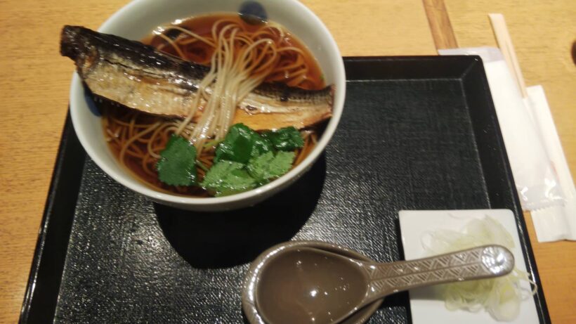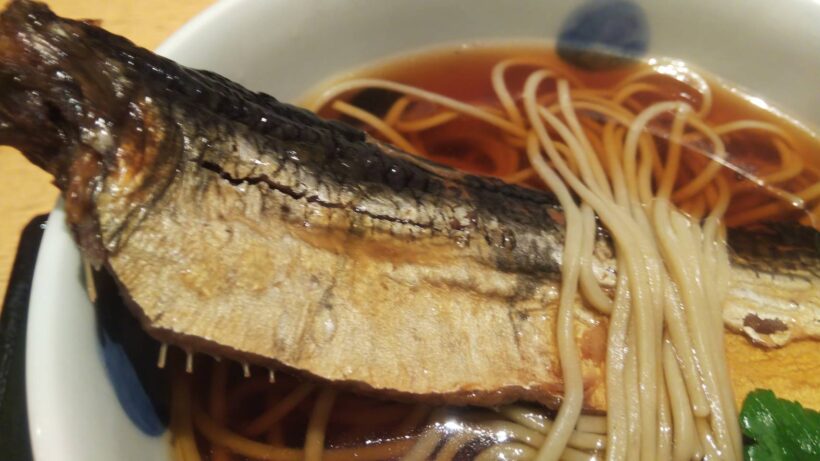 この日頼んだのは看板メニューの一つ、「にしんそば」。運ばれてきた丼を見た瞬間、思わず息をのんだ。一本の身欠きニシンが、まるで主役のようにどっしりと横たわり、丼の縁を堂々とまたいでいる。そのスケール感と存在感に、まず目が釘付けになる。