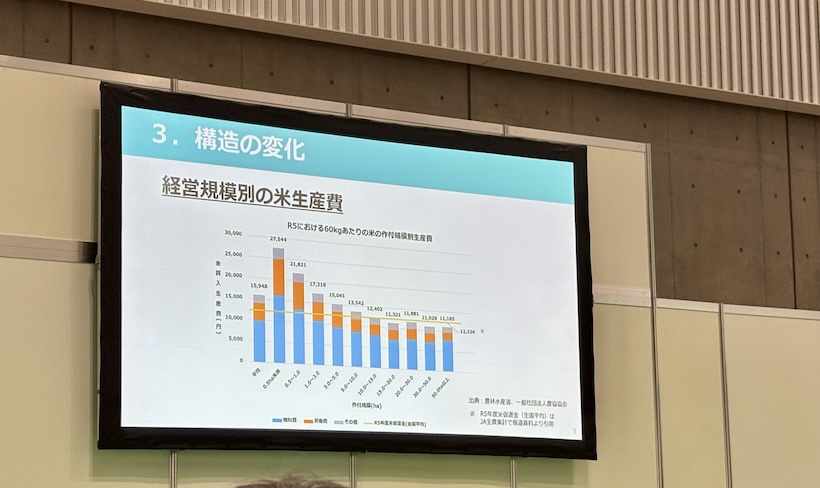 吉田会長によると、作付規模が20ヘクタールまでは生産費が順調に低減する一方、20ヘクタールを境に低減効果が見えにくくなるという。大規模な作付面積を有する農家にとっても、生産費の抑制は大きな課題だと指摘した。