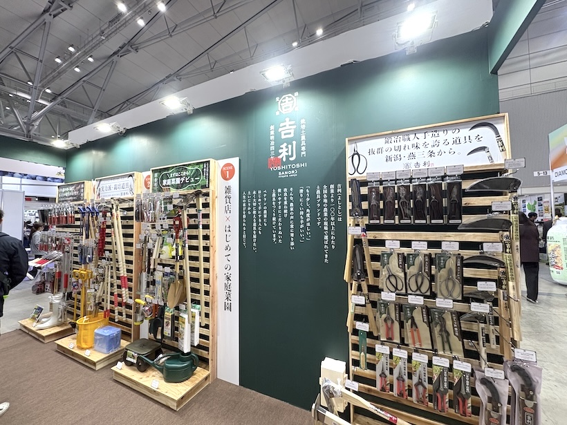 株式会社佐野利(新潟県三条市)のブースでは、燕三条鍛冶職人が手掛ける「吉利」のブランド鍬や鎌など、農道具や刃物などのアイテムが多数並ぶ