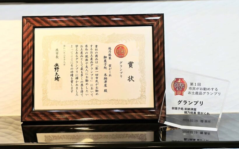第1回「燕市お土産グランプリ」で、株式会社米納津屋(新潟県燕市)の「越乃銘菓 雲がくれ」がグランプリを受賞した。