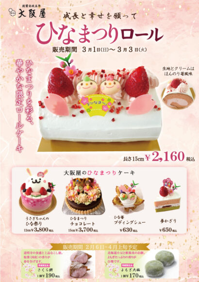 株式会社大阪屋(新潟市江南区)は、3月3日のひな祭りに合わせ、期間限定のひなまつりケーキを販売している。