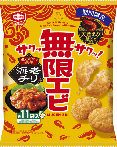 【期間限定で再発売】亀田製菓が濃厚な海老チリの味わい「無限エビ 海老チリ味」を発売
