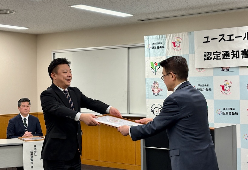 地域のインフラを支える電気設備工事を手がける、成田屋電設の村田靖代表取締役は、社内改善の一環として、男性の育児休業取得を挙げた。「7人の対象者に(育児休業を取得するように)勧めてきたが、思うように取得できない状況だった。助成金を活用し申請に踏み切った。今後も全ての社員がより安全に働けるよう取り組んでいきたい」と意気込みを語った。