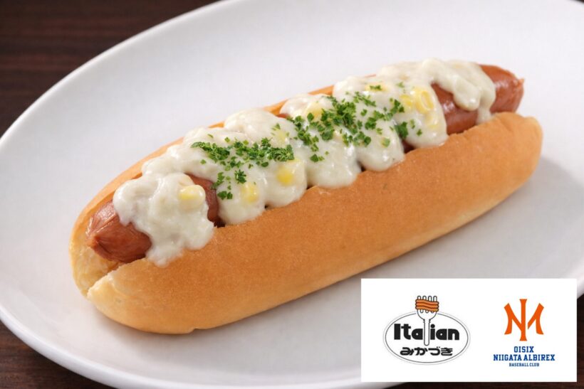 ホワイトイタリアンソースを使った「みかづきコラボ!雪国ドッグ」(画像提供:オイシックス新潟アルビレックスBC)