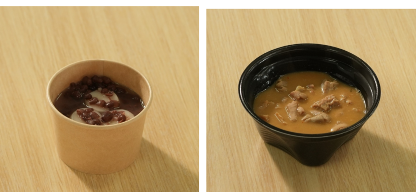 「雪室熟成あんこのお汁粉(写真左)」、人気飲食店「やきとり みやこや」のモツ煮込み鍋をベースに山崎醸造の味噌で仕上げた「モツ煮込み(写真左)」(画像提供:オイシックス新潟アルビレックスBC)