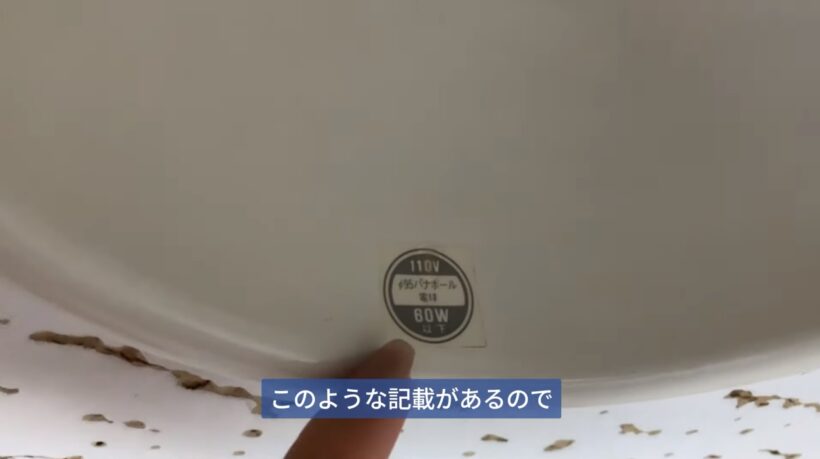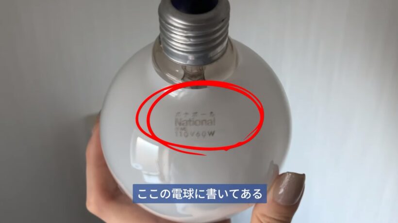 これまでついていた電球を外してもらい、電球に書いてある「110V 60W」というボルト(V)とワット(W)を確認してください。また、古い電球で印字が消えてしまっている場合には、ついていた照明器具を探すと電球の印字と同様の記載があるので、そちらを確認してください。このボルトとワットが合っていないと、新しい電球をつけてもつかなくなってしまいます。