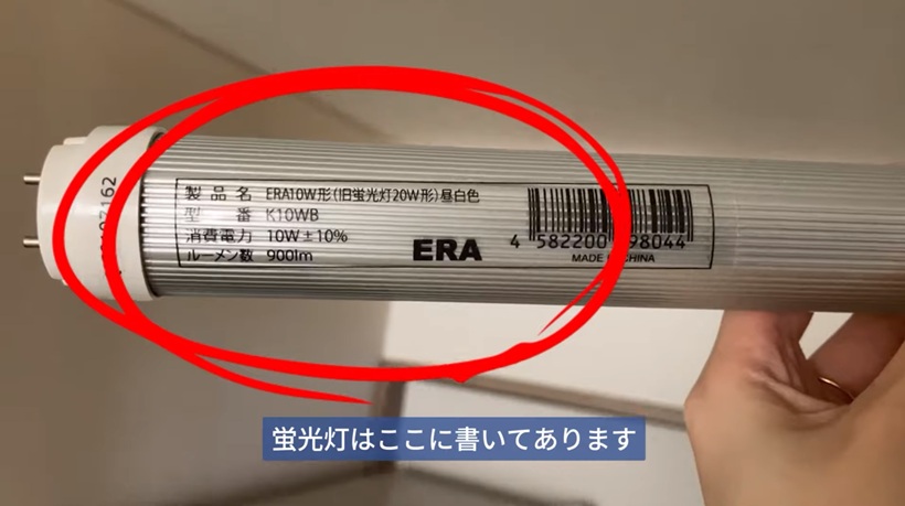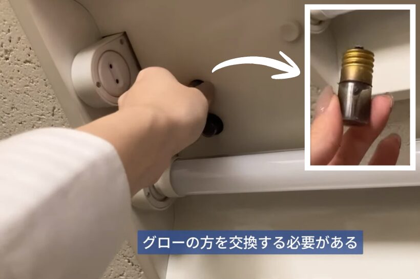 蛍光灯は、本体端に書いてあります。蛍光灯を替えても電気が点かない場合は、こちらのグローの方を交換する必要がある可能性もあります。グローの方も交換していただけると、確実に電気が点くと思います。