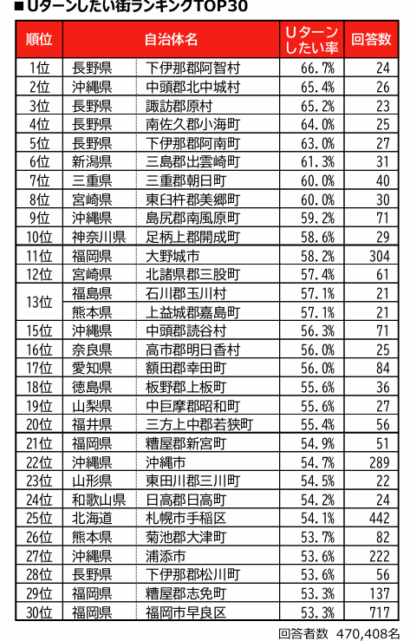 アンケートは、全国47都道府県に居住し、出身地を離れて暮らす20歳以上の男女を対象に、2021年~2025年の合計470,408名から回答を得て、インターネット経由で実施された(男性49.2%、女性50.8%)。回答方法は「出身地に戻りたいか」を5段階(「そう思う」「どちらかといえばそう思う」「どちらでもない」「どちらかといえばそう思わない」「そう思わない」)で調査し、「そう思う」「どちらかといえばそう思う」の人数の割合を算出してランキングを作成した。今回発表されたのは上位30位の基礎自治体。