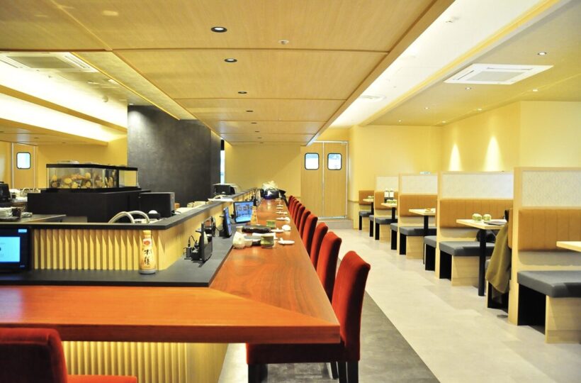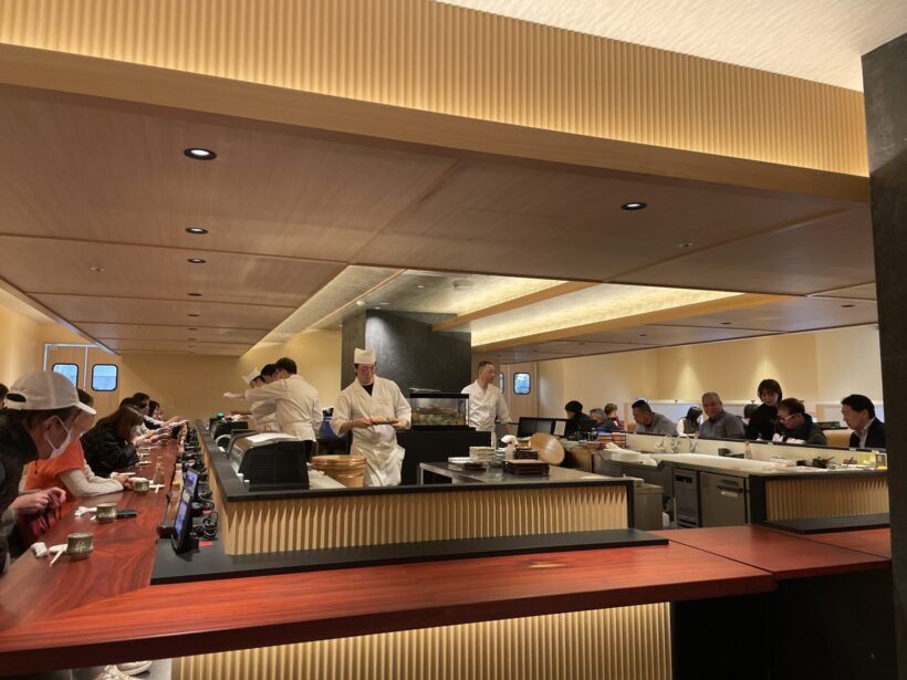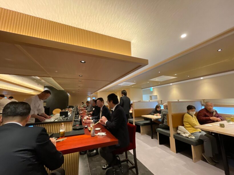 店内は寿司職人の手さばきを眺めるカウンター席、ファミリー向けのボックス席、テーブル席、新潟や佐渡の地酒を楽しめるバーカウンターと多彩な構成。バーカウンターはウェイティングバーとしても機能し、待ち時間にもお酒やソフトドリンクを楽しめる。テーブル席は最大25名程度の宴会に対応できるなど、あらゆる需要に応える空間デザインは津田沼店ならではの工夫だ。
