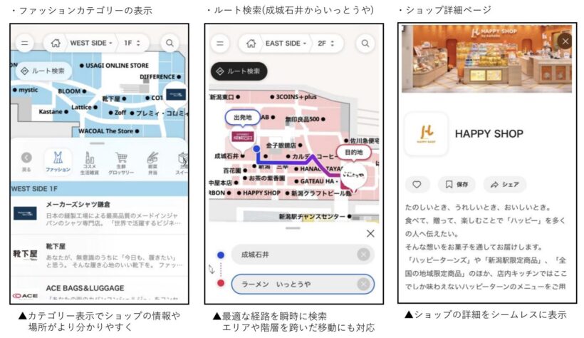 同サービスは専用アプリのインストールが不要で、ウェブブラウザからアクセスできる。ショップや施設のキーワード検索のほか、現在地から目的地までの最短ルートを表示する経路案内機能を備える。階段やエレベーターの位置を考慮したバリアフリー案内にも対応し、館内回遊の利便性向上を図る。