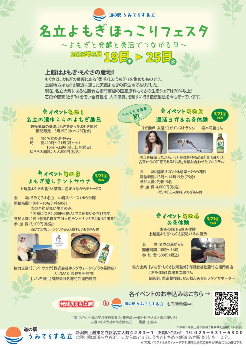 道の駅うみてらす名立は3月19日から3月25日まで、「名立よもぎほっこりフェスタ~よもぎと発酵と美活でつながる日~」を開催する。