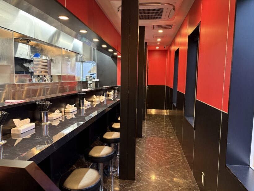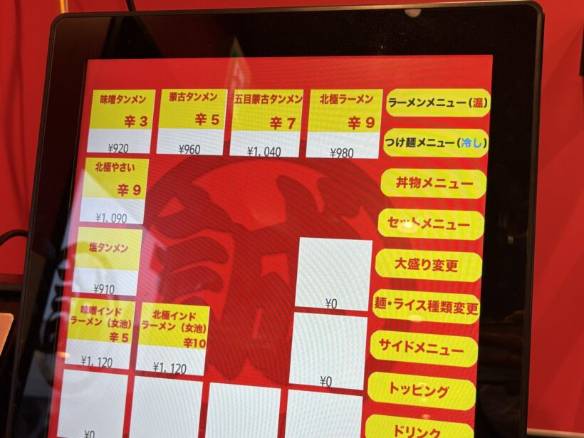 定刻を迎え、店内へ。まずはタッチパネル式の食券機で注文するスタイルだ。看板メニューの「蒙古タンメン」をはじめ、より辛さを強めた「北極ラーメン」や、味噌ベースの「味噌タンメン」、つけ麺タイプの「冷し味噌ラーメン」など、辛さと味のバリエーションが幅広いのが特徴。辛さのレベルも細かく設定されており、自分に合った一杯を選べる。