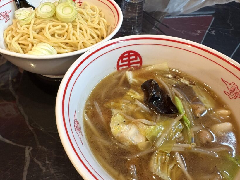 なお、この日は辛いものが苦手な後輩キシャも同行し、「冷やし醤油タンメン」(940円)を注文した。こちらは辛味のない一杯で、たっぷり野菜が入った温かい醤油ベースのスープと麺が別々に登場するつけ麺スタイルだ。
