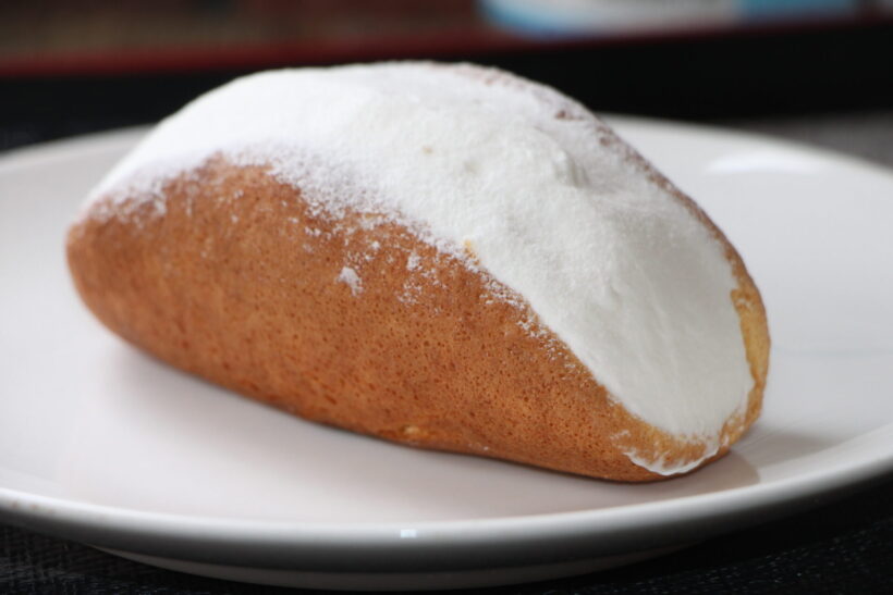 バナナオムレット(税別350円)。この、生クリーム部分とスポンジがシームレスに仕上がった美しいフォルムは、しばらく黙って見ていられる