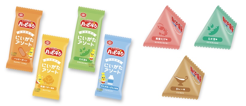 新潟発祥の定番「いつものハッピーターン」に加え、「佐渡バター風味」「えだ豆味」「ヤスダヨーグルト風味」のハッピーターン4種類と「南蛮えび味」「えだ豆味」「カレー味」の亀田の柿の種3種類が入っている。新潟ならではの味わいが同時に楽しめる充実した内容だ。いずれも個包装で、味ごとに色分けされたオレンジ色を基調とした彩り豊かなパッケージが特徴。
