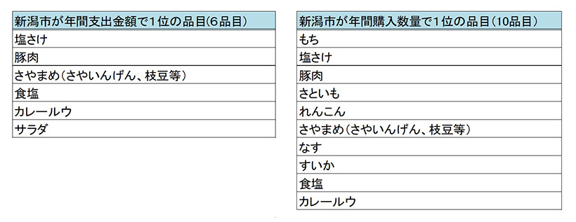 今回の結果によると、新潟市は年間購入数量において「もち」「塩さけ」「豚肉」「さといも」「れんこん」「なす」「すいか」など10品目で全国1位を記録した。また、年間支出金額でも「塩さけ」「豚肉」「さやまめ」「カレールウ」「サラダ」など6品目が1位となっており、地域の食文化の特色が色濃く反映された形だ。