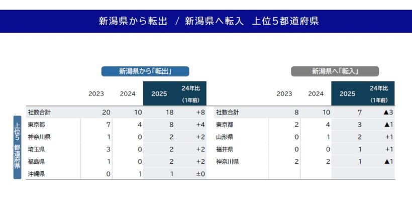 帝国データバンク新潟支店はこのほど、新潟県内企業の本社移転動向(2025年)を発表した。それによると、2025年に県外へ本社を移転した企業は18社で、前年(10社)から8社増加。一方、県外から新潟県へ本社を移転した企業は7社(前年10社)にとどまり、2年ぶりに転出が転入を上回る「転出超過」となった。