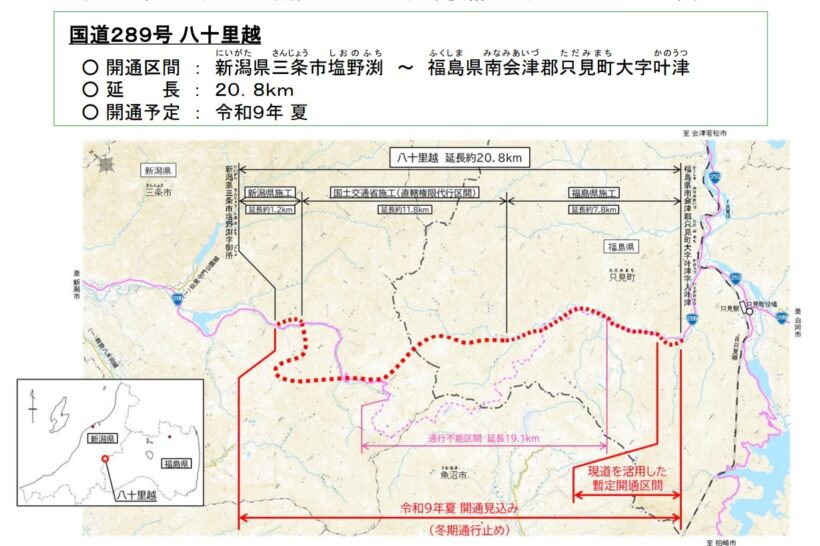 新潟と福島をつなぐ「国道289号 八十里越」、2027年夏に暫定開通へ 2026-03-27 2時間前 中越 地域・くらし 観光 長岡国道事務所の資料より 長岡国道事務所は3月27日、工事が進められている「国道289号 八十里越」について、2027年夏に暫定開通する見通しが立ったと発表した。 なお、福島県側の一部区間は暫定開通後にも追加の雪崩対策が必要となる。このため、一部で現道を活用することとなり、冬季は通行止めとなる。 同区間の工事が完了次第、冬季も含めた通年での全線開通となる予定。