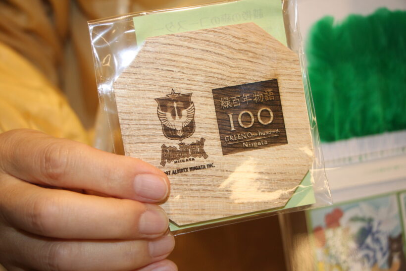 1000円以上募金した人にはアルビレックス新潟のロゴ焼き印が入った特製コースターを進呈