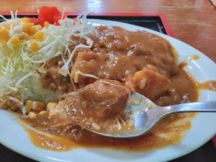 スプーンで一口。おお、このコク深さ。よく町中華のカレーにある甘だるい味ではない。よく煮込まれている。肉がほろっほろに柔らかいもの。ああ、好きなカレーだな。