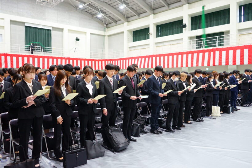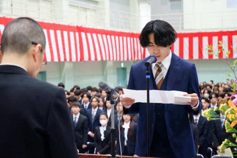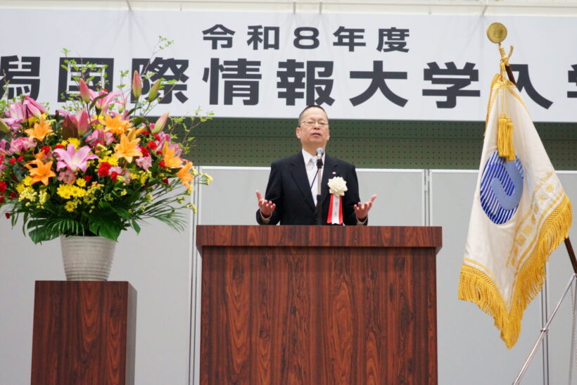 新入生による私の抱負では、経営情報学部情報システム学科の瀬倉結軌さんが新入生代表として登壇し、「世界では戦争や貧困など多くの課題が起きており、異文化を理解するためには自国の文化や現状を深く知ることが必要だと考えている。新たな環境で多くの人と出会い、時に衝突しながら経験を重ね、人間的にも成長していきたい。四年間を有意義なものにするため、常に向上心と謙虚さを忘れず、先生方から多くを学びながら日々成長していくことを誓う」と決意を示した。