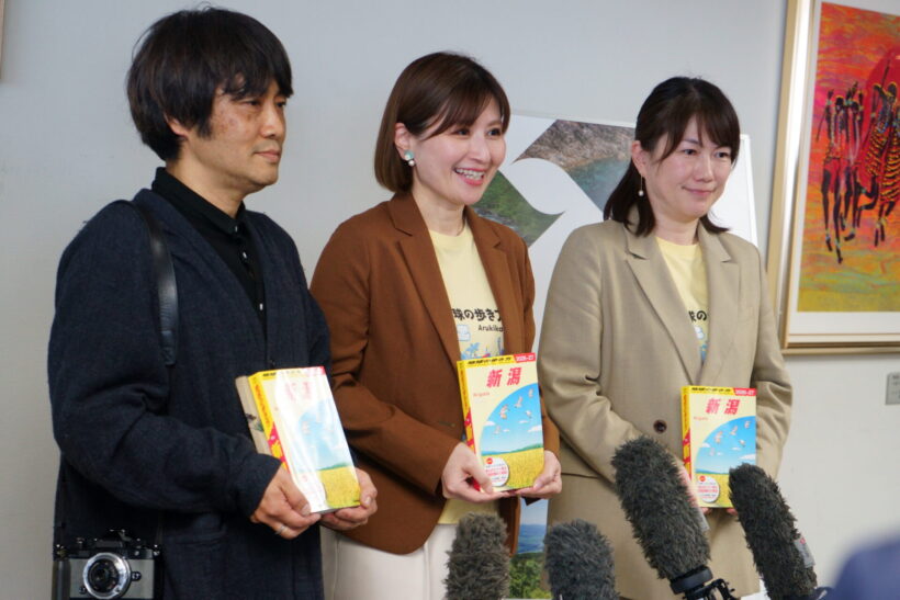 左から、株式会社地球の歩き方の清水裕里子新潟版担当プロデューサー、新潟県知事の花角英世氏、同社の由良暁世編集長