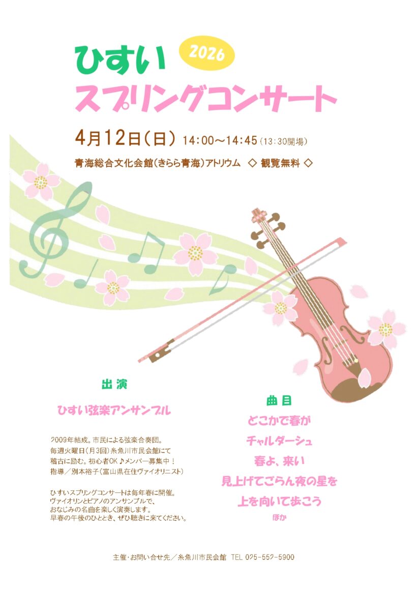 新潟県糸魚川市は4月12日14時から、青海総合文化会館アトリウムで「ひすいスプリングコンサート」を開催する。