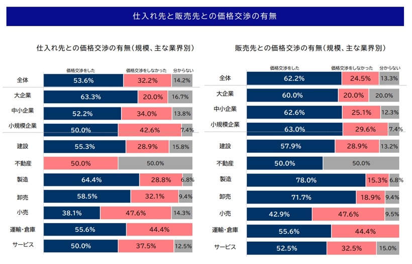 価格交渉については、仕入れ先と交渉した企業が53.6%、販売先と交渉した企業が62.2%だった。業界別では、価格交渉ができている割合は「製造業」が最も高く、仕入れ先で64.4%、販売先で78.0%となった。