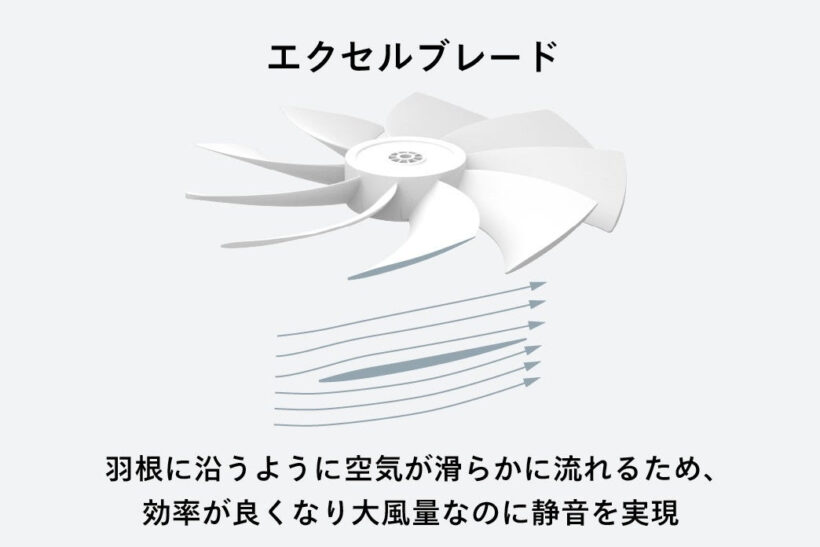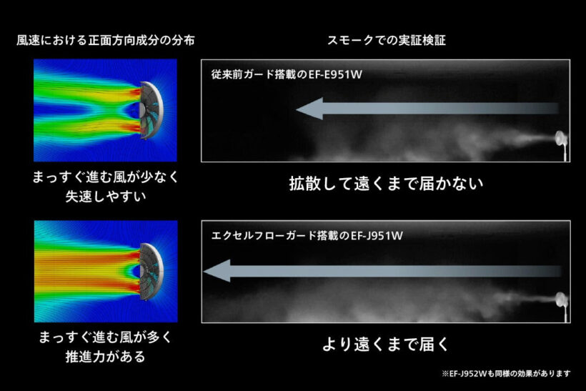 新たに採用した「エクセルフローガード」は、ジェットエンジンの静翼の考え方を応用した独自設計。空気抵抗を抑えつつ風向きを整え、運転音を抑えたまま風速を従来機種比で約20%向上させた。