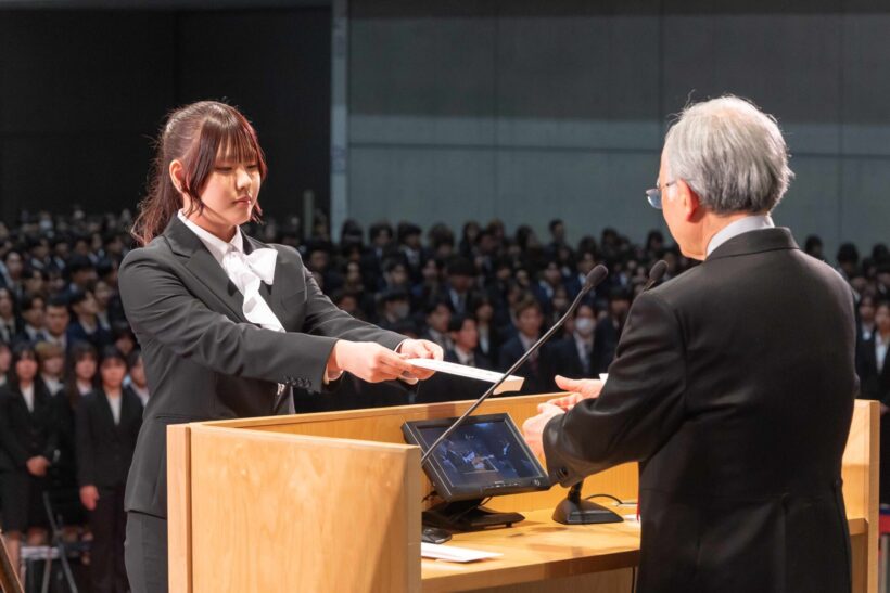 新入生代表でリハビリテーション学部作業療法学科の傘木玲奈さんは、「思いやりを大切にして、将来は一人ひとりの生活の質を高めることのできる優れたQOLサポーターになれるよう、日々精進してまいります」と述べ、大学生活への決意を示した。