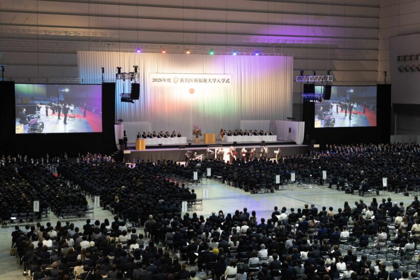 新潟医療福祉大学(新潟市北区)は4月8日、新潟市中央区の朱鷺メッセで2026年度入学式を行い、全国から集まった新入生約1,300人が新たな一歩を踏み出した。