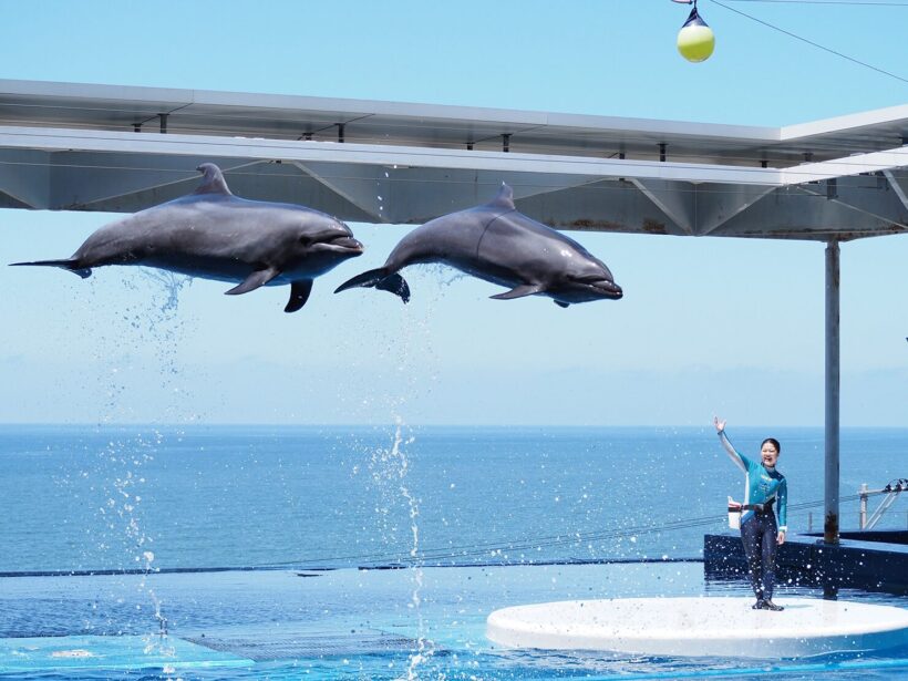 人気のイルカパフォーマンスは期間中毎日実施。日本海を背景に、音楽に合わせたジャンプやトレーナーとの水中演技を披露する(プレスリリースより)