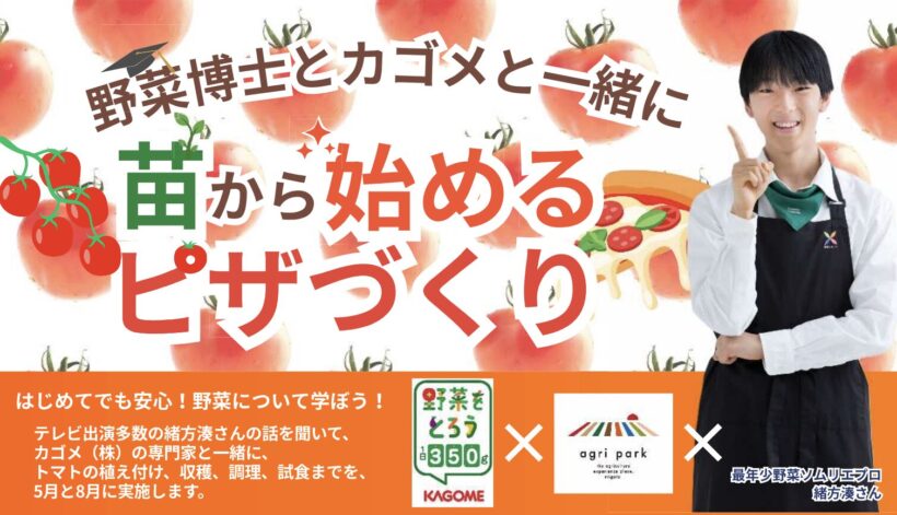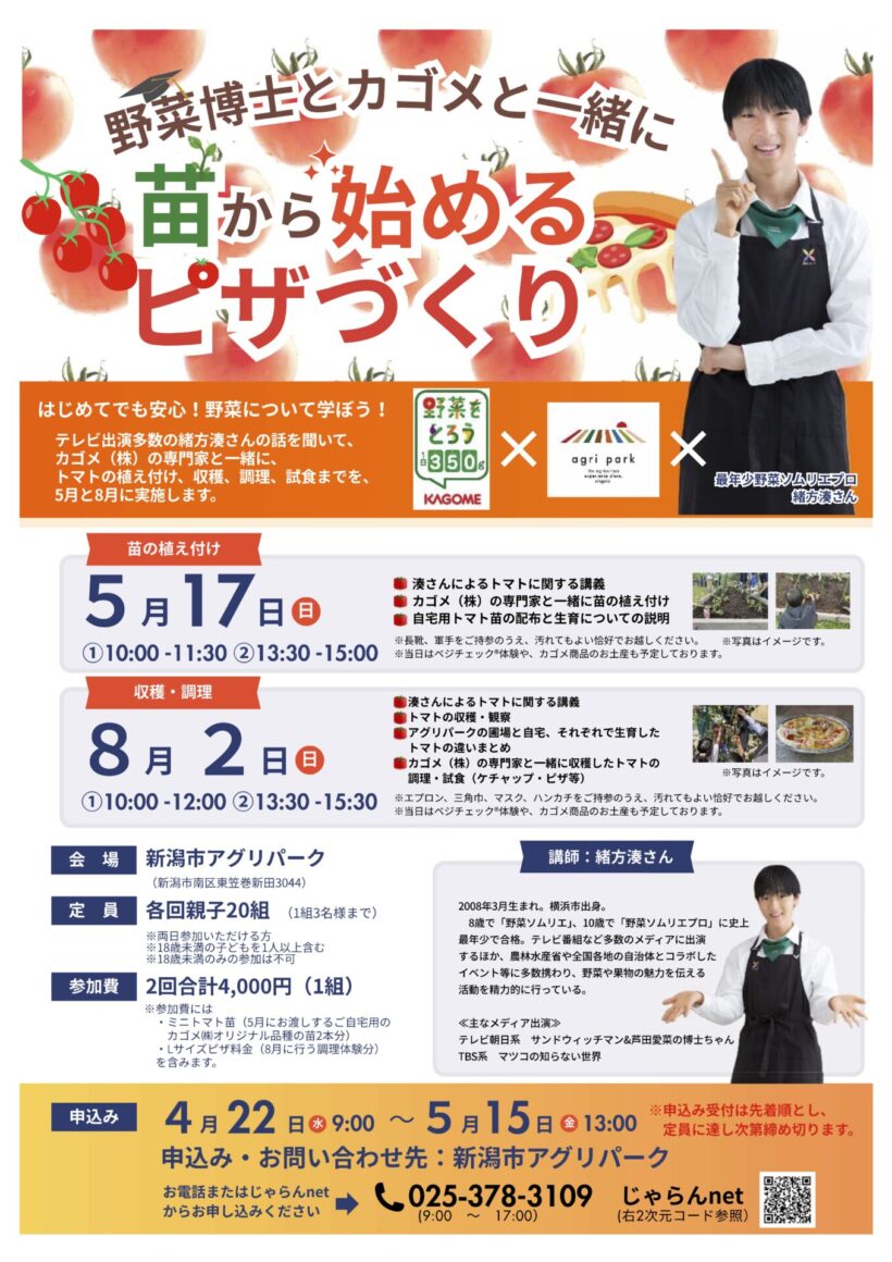 新潟市は、最年少の野菜ソムリエプロ・緒方湊さんとカゴメ株式会社(愛知県名古屋市)、アグリパーク(新潟市南区)がコラボレーションした体験イベント「苗から始めるピザづくり」を5月17日と8月2日にアグリパークで開催する。