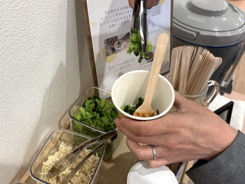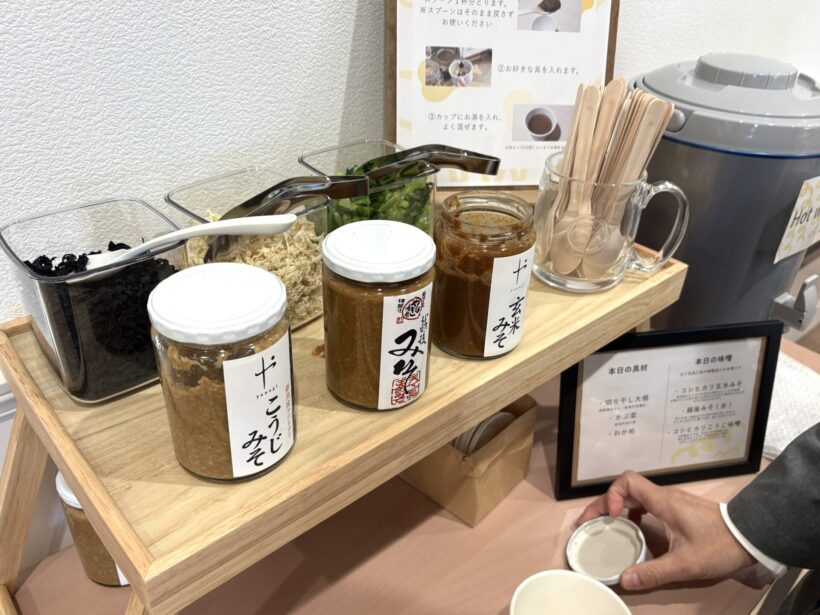 カップを受け取り、自分で味噌と具材を選んでお湯を注ぐセルフスタイルだ。味噌は長岡市摂田屋の「柳醸造」から、この日はコシヒカリ玄米みそ、越後みそ(赤)、コシヒカリこうじ味噌の3種類が用意されていた。具材は切り干し大根、かぶ菜、わかめなどから好みで選べる。しかも、おかわりも可能というからうれしい。