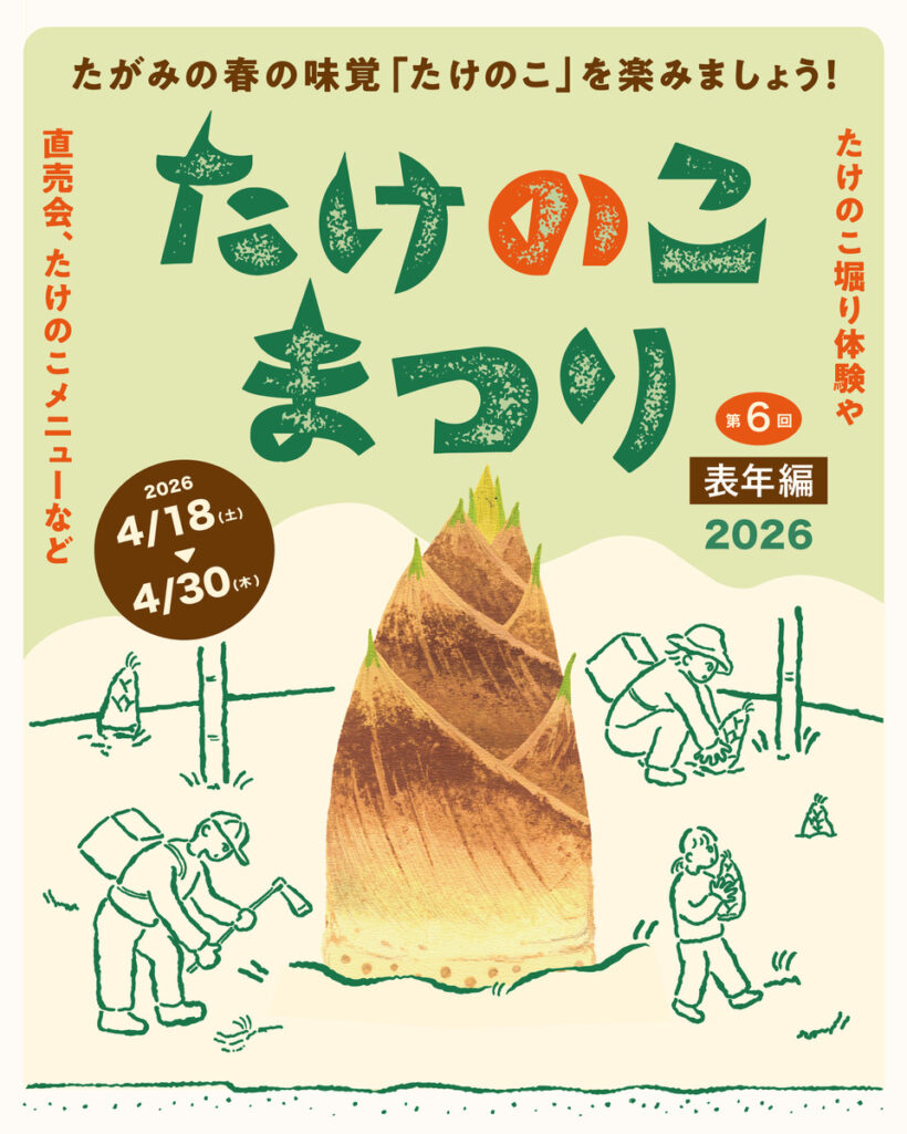 また、25日から5月6日までの期間は毎日タケノコ掘り体験を実施する。地元のタケノコ農家から収穫のコツなどを学びながらタケノコ掘りができる。参加費は2,500円(税込)、定員10人で、予約制(予約は道の駅たがみまで)。