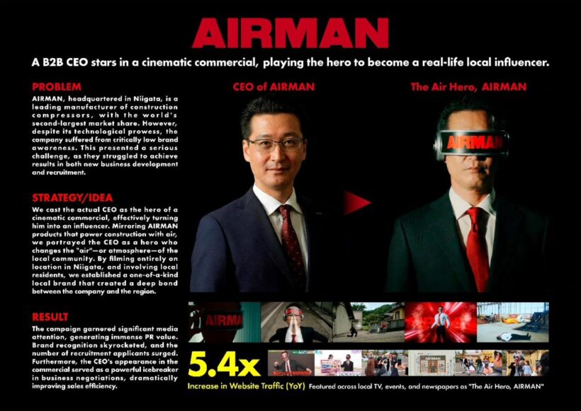 同作品には、同社代表取締役社長の佐藤豪一氏が出演している。Creative B2B部門内の「Innovative use of Content」として掲載されており、佐藤氏が空気の力で人々を救う謎のヒーロー「AIRMAN」として登場する映像シリーズとなっている。