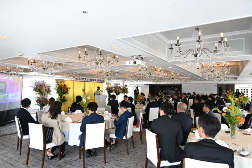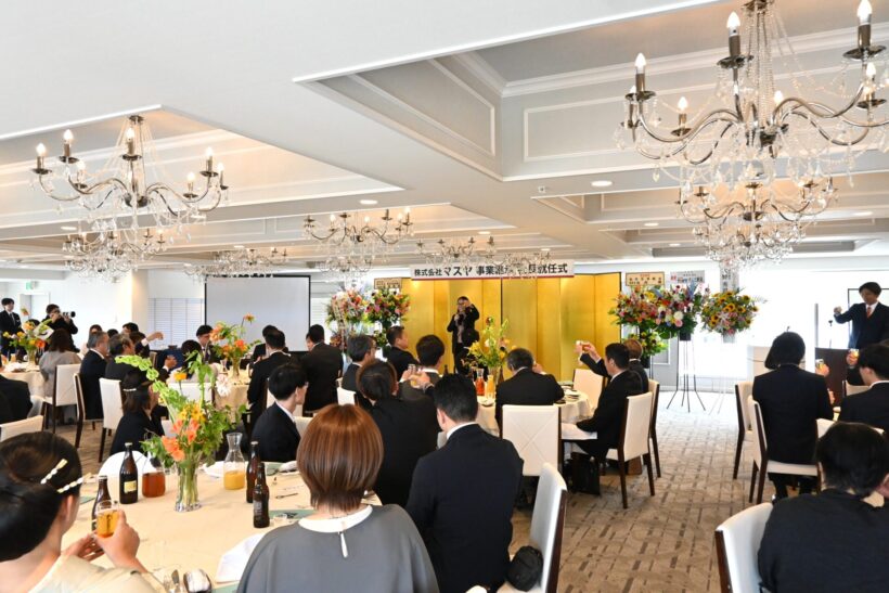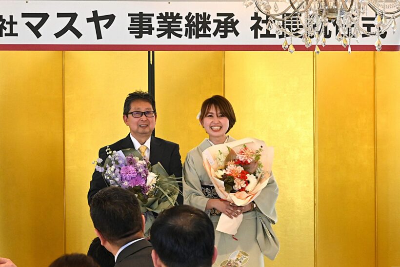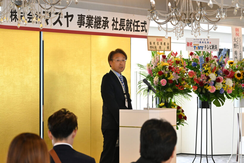 新潟市南区のスーパー「マスヤ味方店」を運営する株式会社マスヤは4月22日、ホテルイタリア軒で代表取締役社長就任式を開き、3月5日付で就任した栗林礼奈社長が今後の経営方針と新事業構想を発表した。式典には取引先や支援者、行政関係者ら約70人が出席し、新体制の門出を祝った。