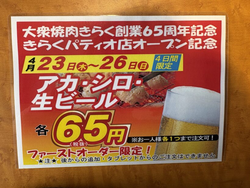【人気の肉やビールが65円で】見附の大衆焼肉きらくパティオ店が4日間のオープンキャンペーンを実施