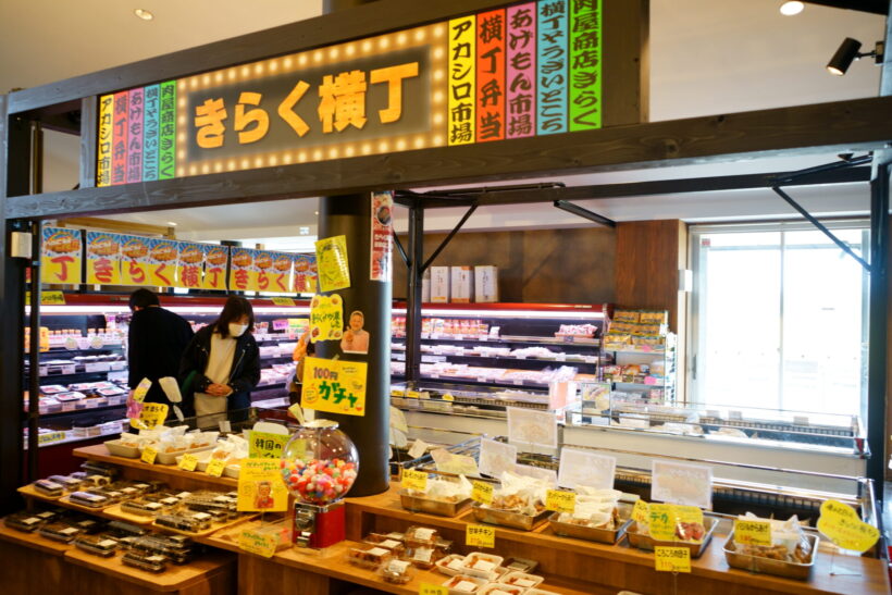 きらく横丁では、人気のキンパやきらく焼肉セット、総菜、冷凍商品など、長年親しまれてきた商品を購入できる。