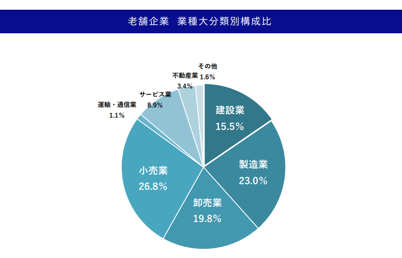 業種別では、小売業が26.8%で最も多く、製造業(23.0%)、卸売業(19.8%)と続き、3業種で約7割を占めた。さらに細分類では酒類卸売業が最多となるなど、酒関連業種の多さが特徴となっている。
