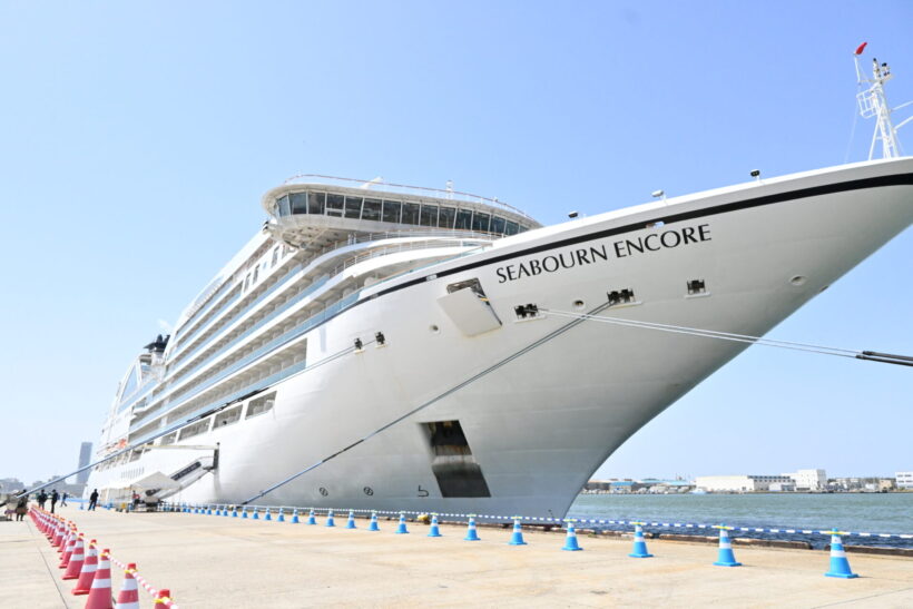 新潟港西港区山の下ふ頭に4月21日、国際クルーズ船「シーボーン・アンコール」(船籍・バハマ)が初寄港し、船内で歓迎式典が開かれた。新潟県や新潟市、国土交通省関係者らが出席し、記念品の贈呈などで初入港を祝った。
