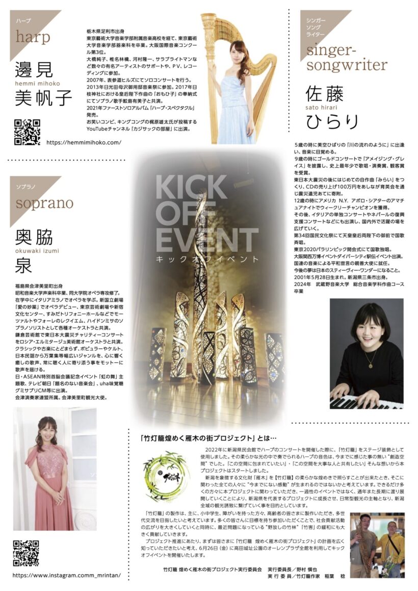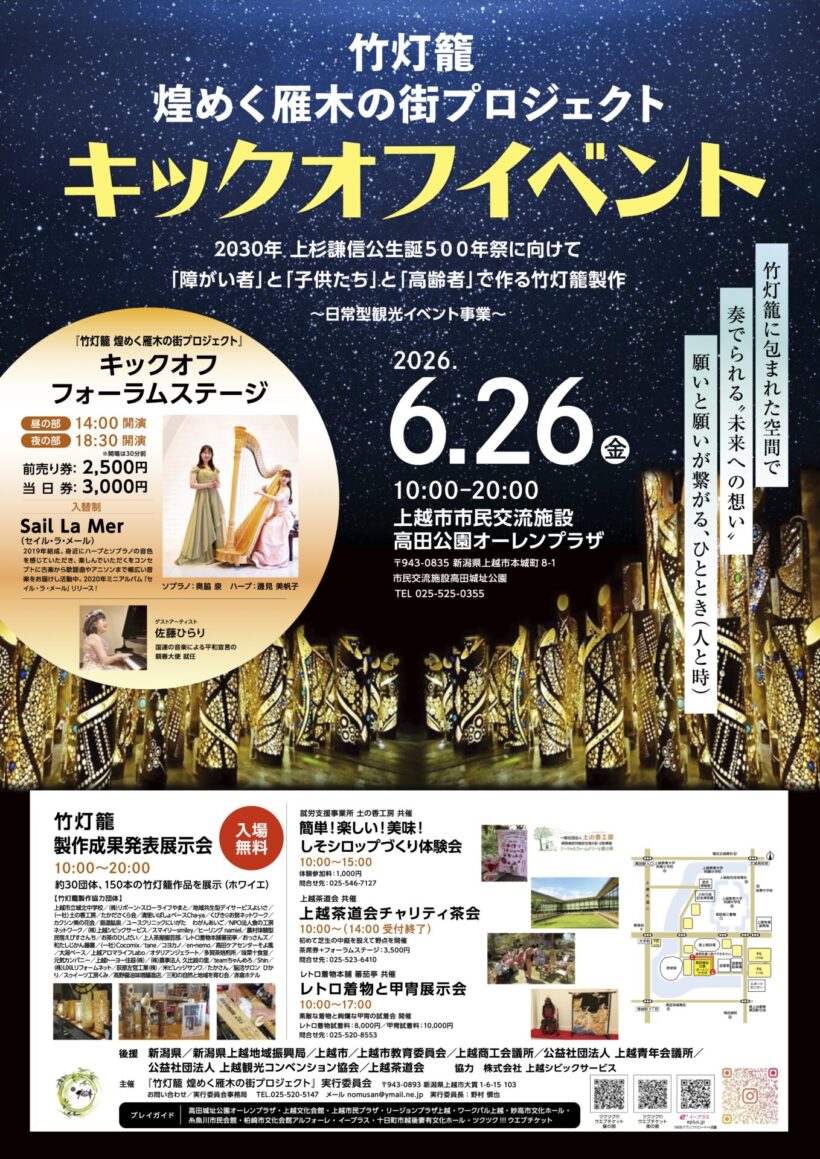 同プロジェクトのキックオフイベントと位置付け、内容は①ハープとソプラノのユニット「セイル・ラ・メール」、及びシンガー・ソングライター佐藤ひらりさんのピアノ演奏(14時と18時30分)、②約40団体150本の竹灯籠製作成果発表展示会③しそシロップづくり体験会④上越茶道会チャリティ茶会⑤レトロ着物と甲冑展示会などからなる。来年6月には上越3市や新潟、長岡など7会場にて計画する。